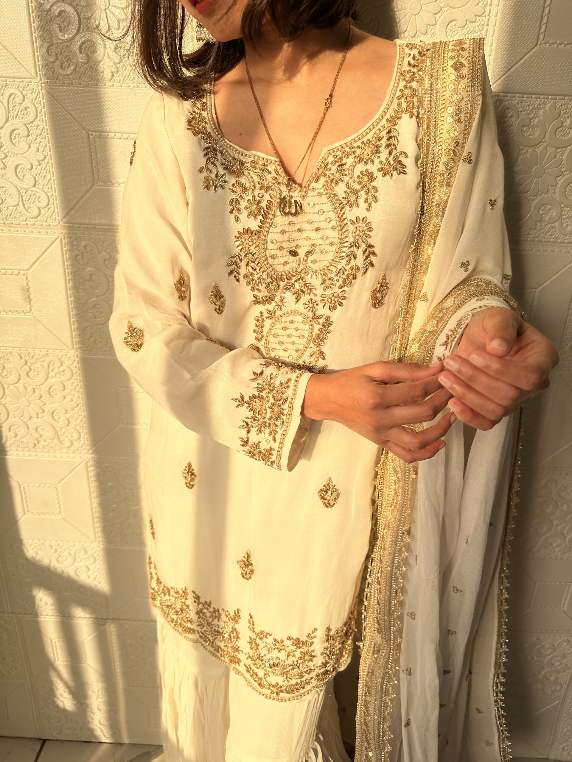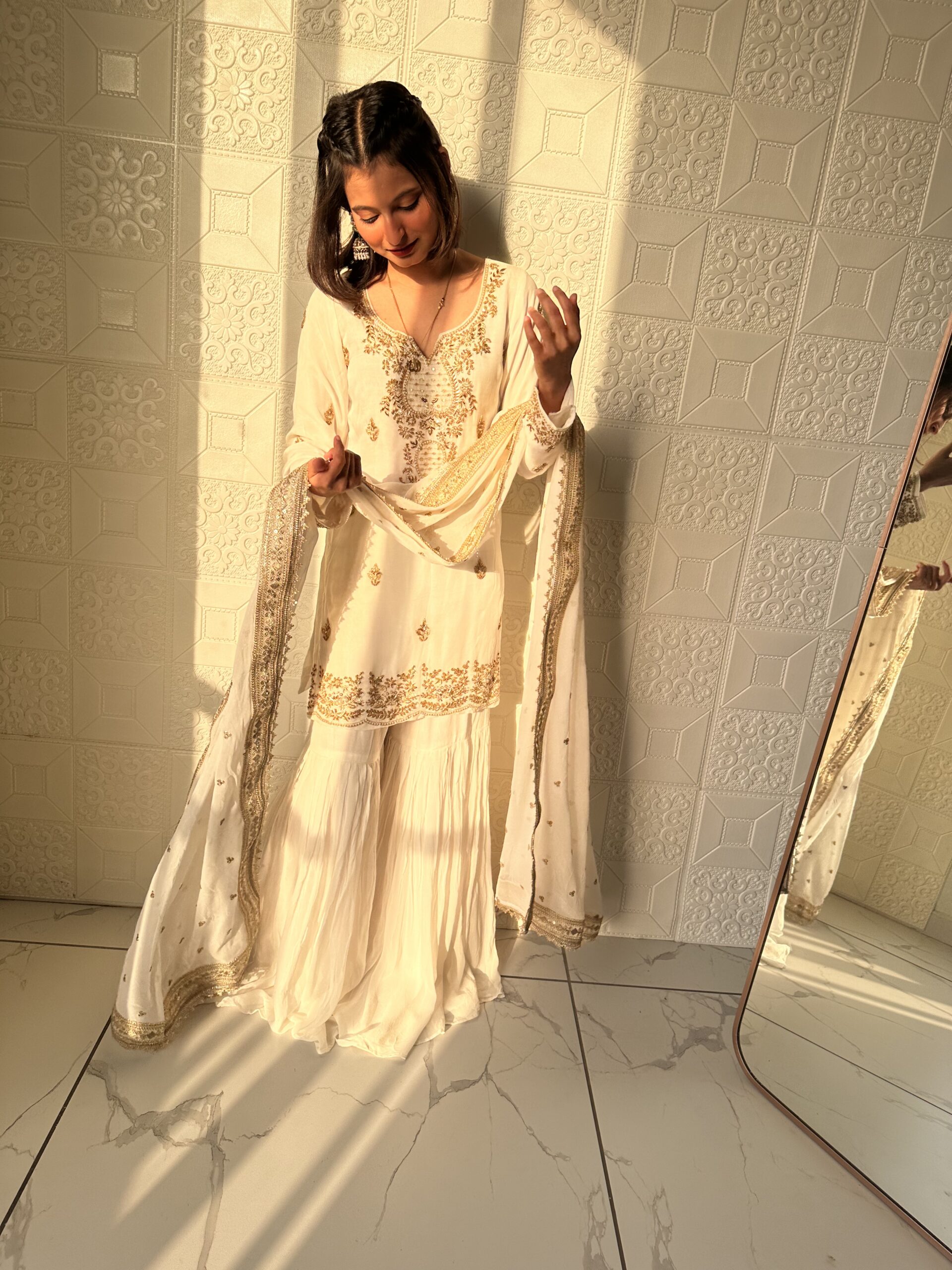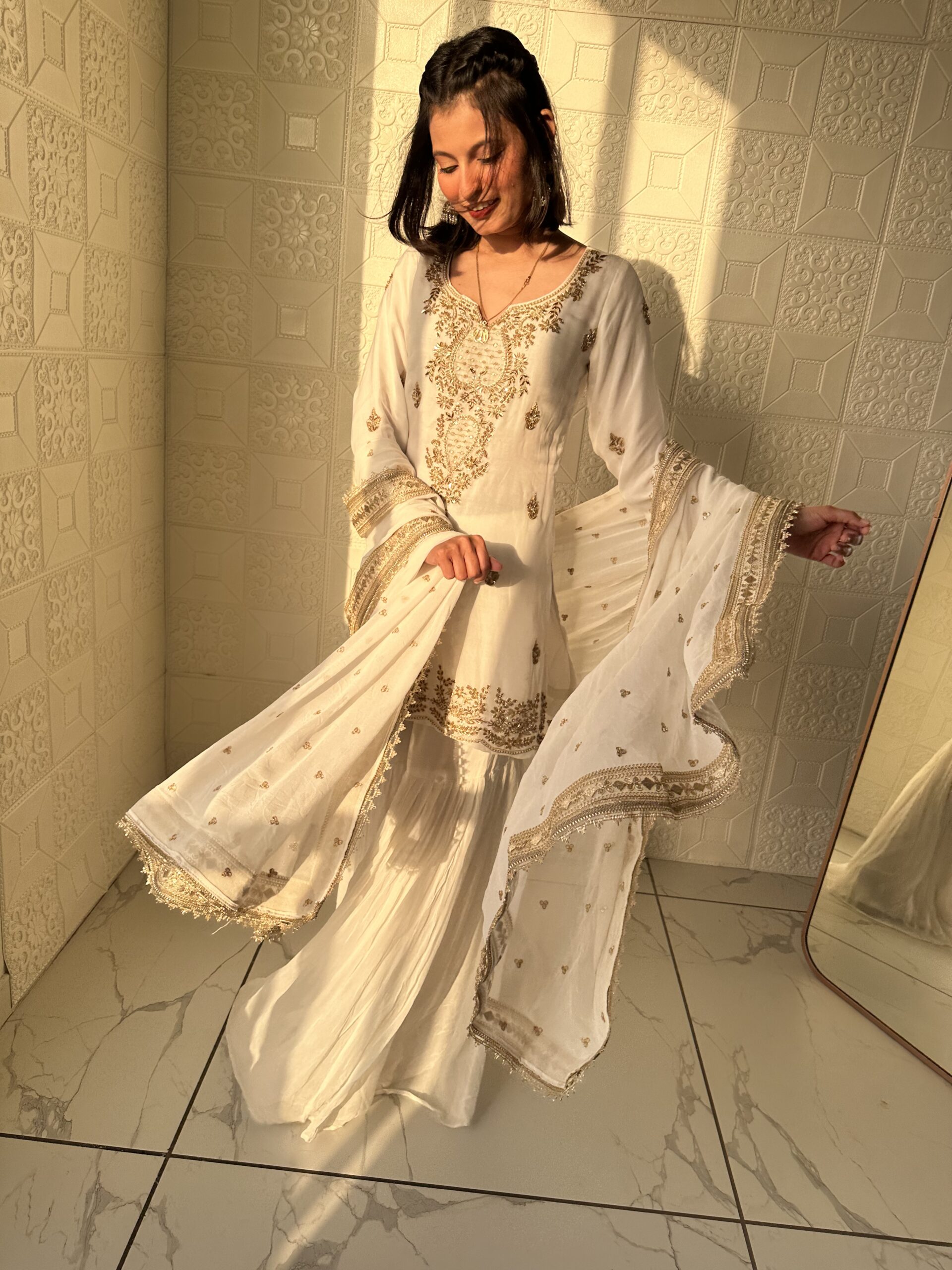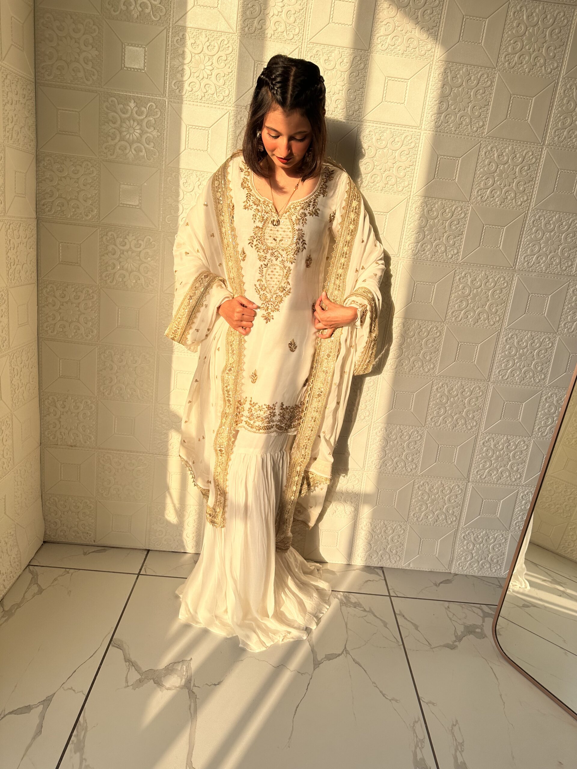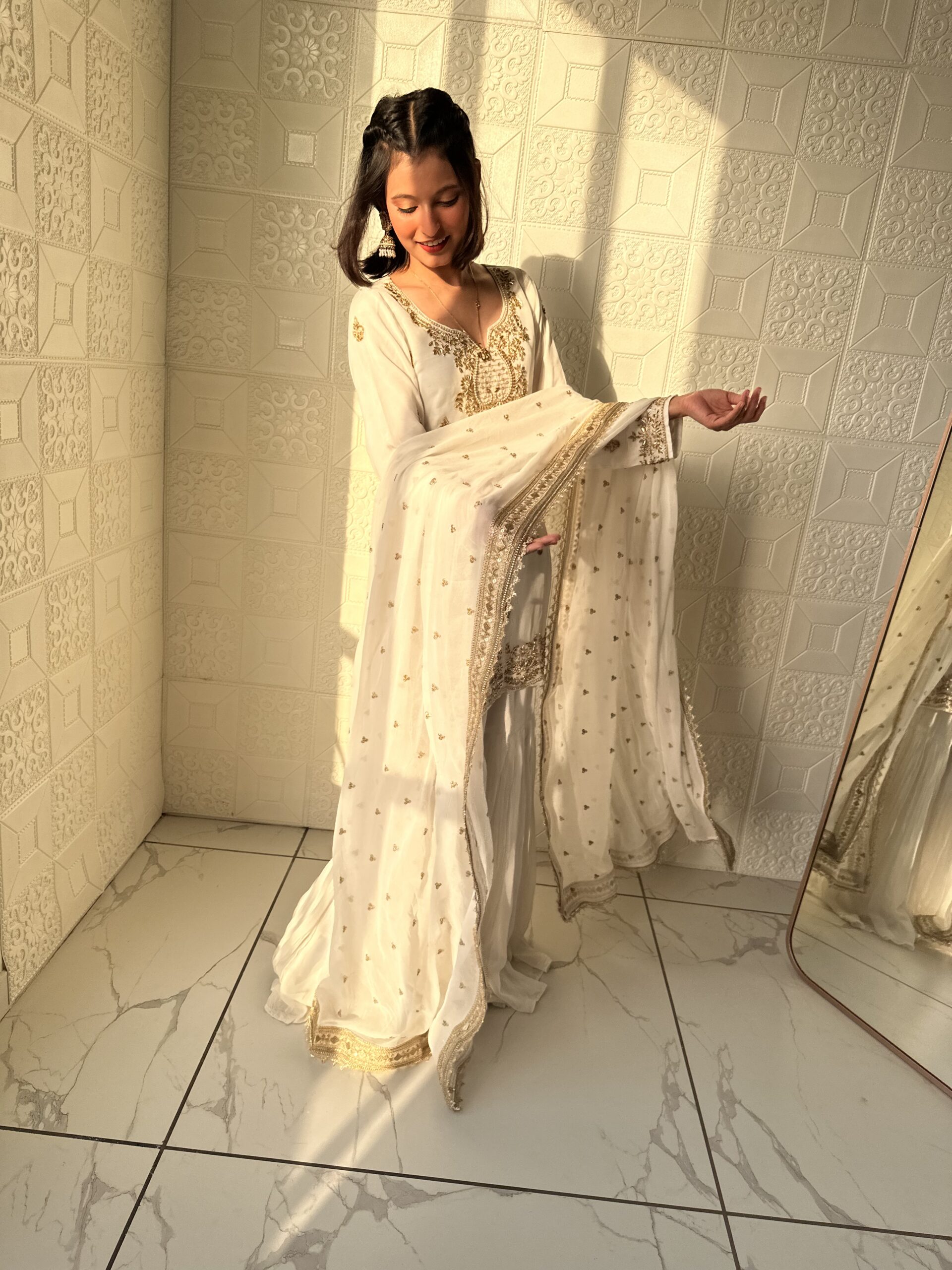 SKU: N/A Categories:Gharara, Hand Work, INDIAN Tag:A celestial sparkle in white and gold.