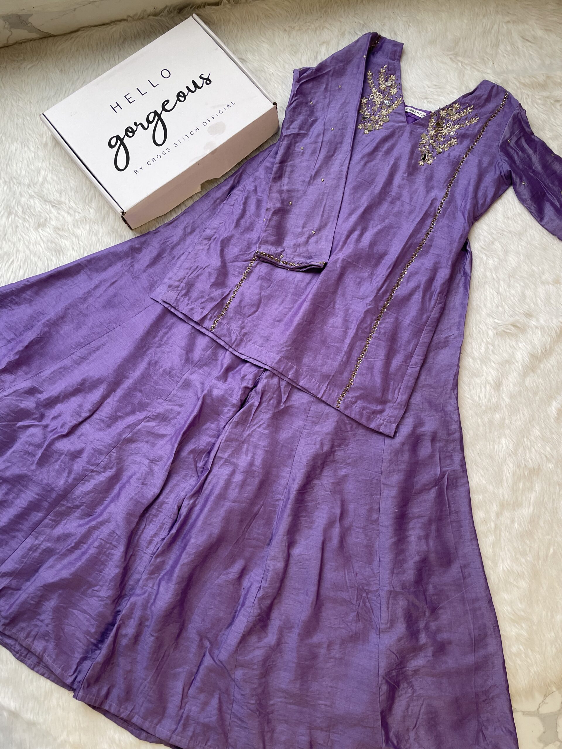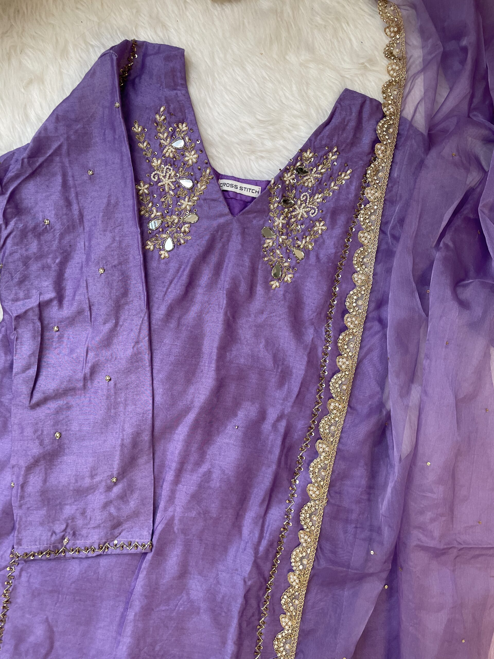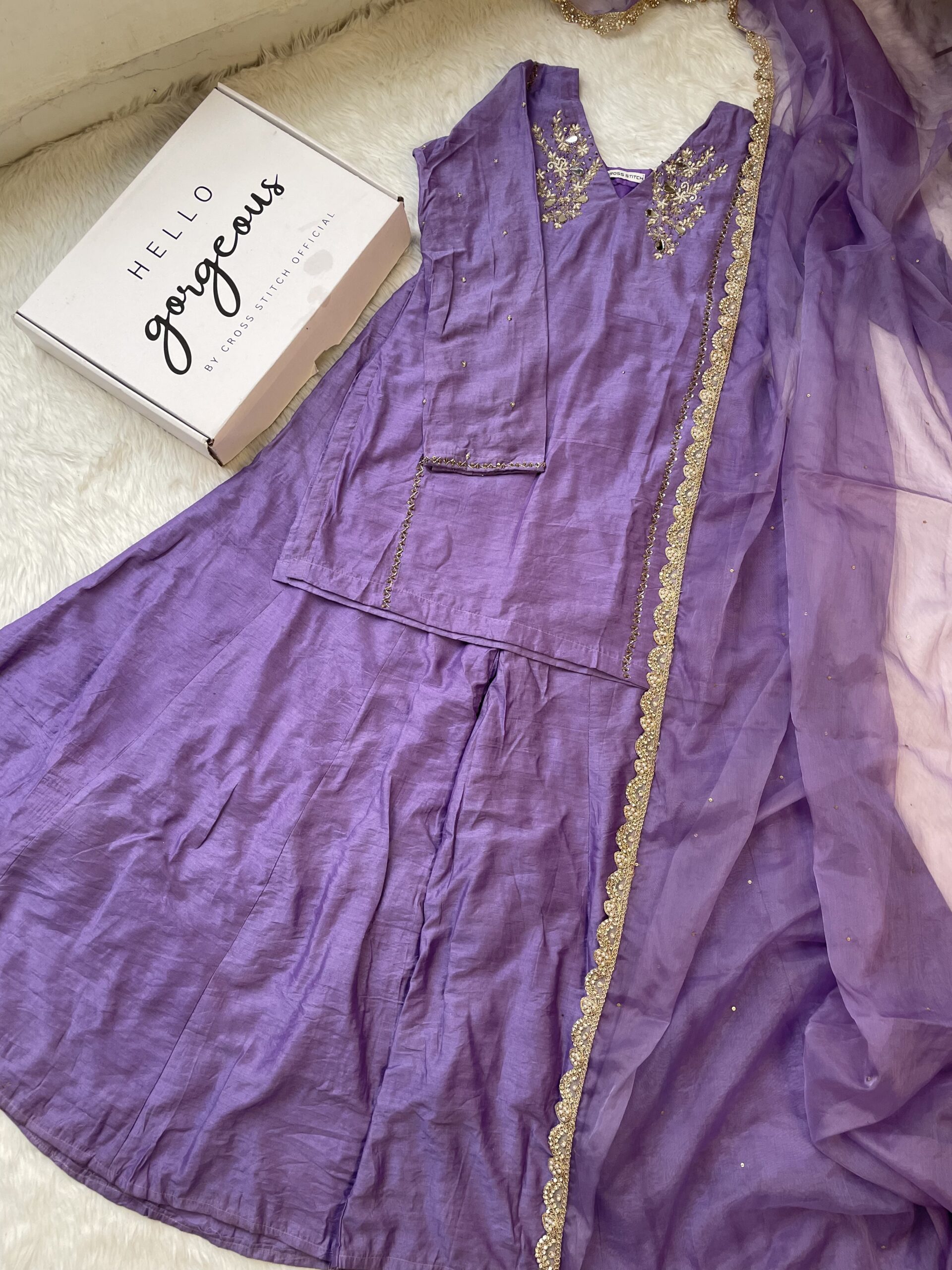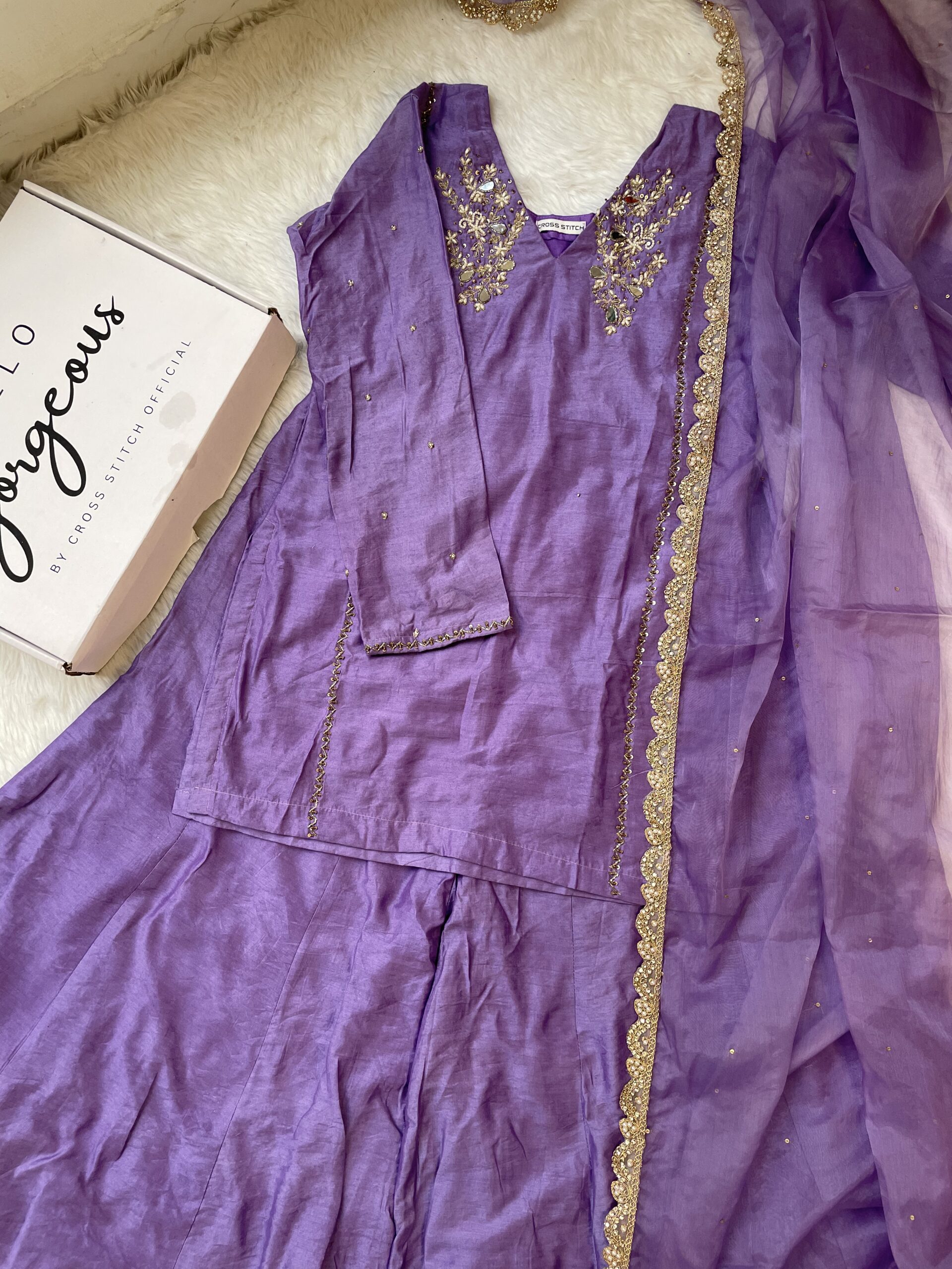 Lavender mull chanderi sharara set with delicate handwork on neckline and motifs, paired with organza dupatta finished with lace detailing. Cotton lining ensures all-day comfort.