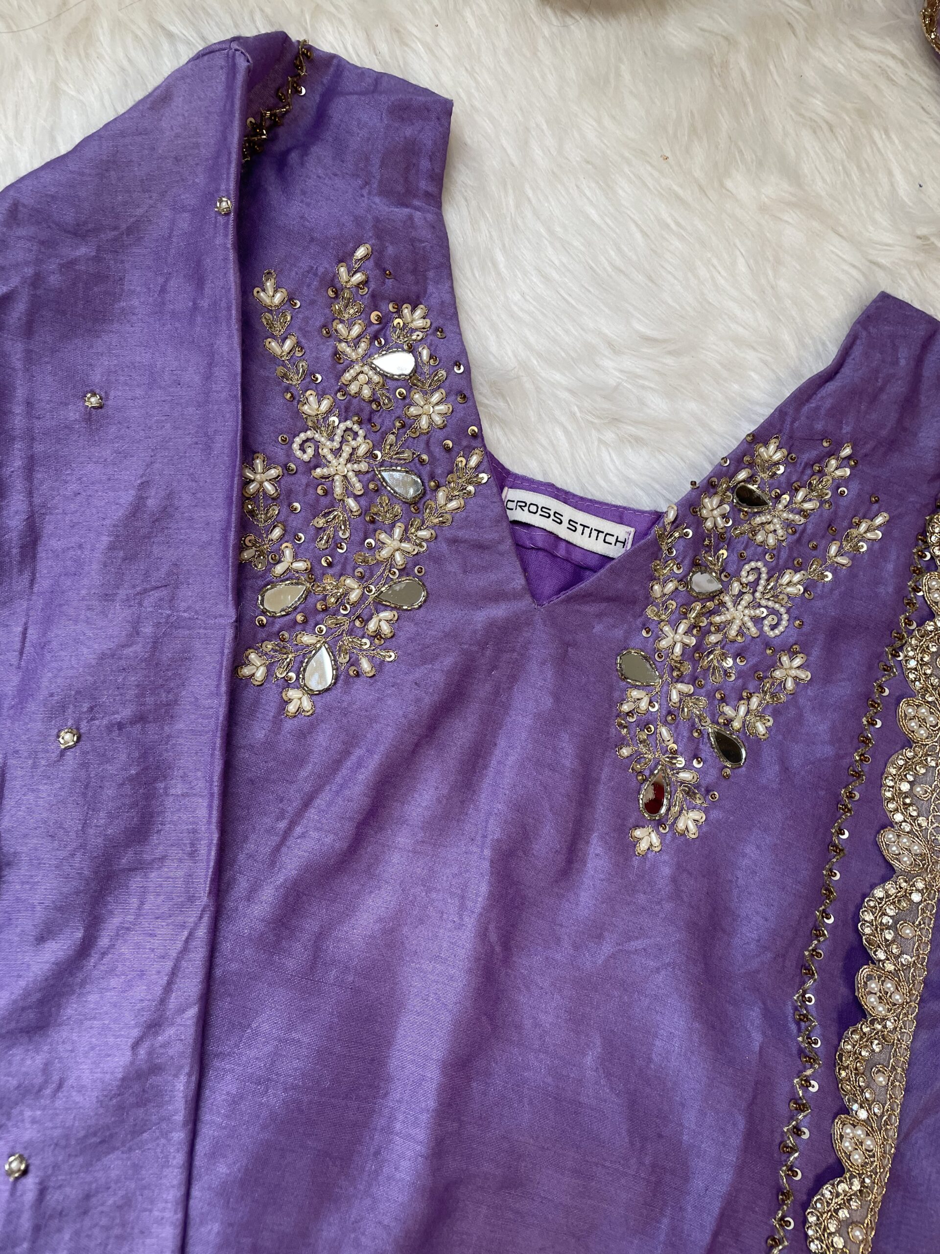Embrace elegance with this lavender sharara set crafted in soft mull chanderi fabric. The kurta features intricate handwork around the neckline, complemented by two motif-style embellishments and additional delicate work across the outfit for a refined finish. Paired with a flowy sharara for graceful movement, the set is completed with an organza dupatta, beautifully adorned with lace borders. Designed with breathable cotton lining, this ensemble blends comfort with sophistication, making it perfect for festive occasions, weddings, or evening gatherings.