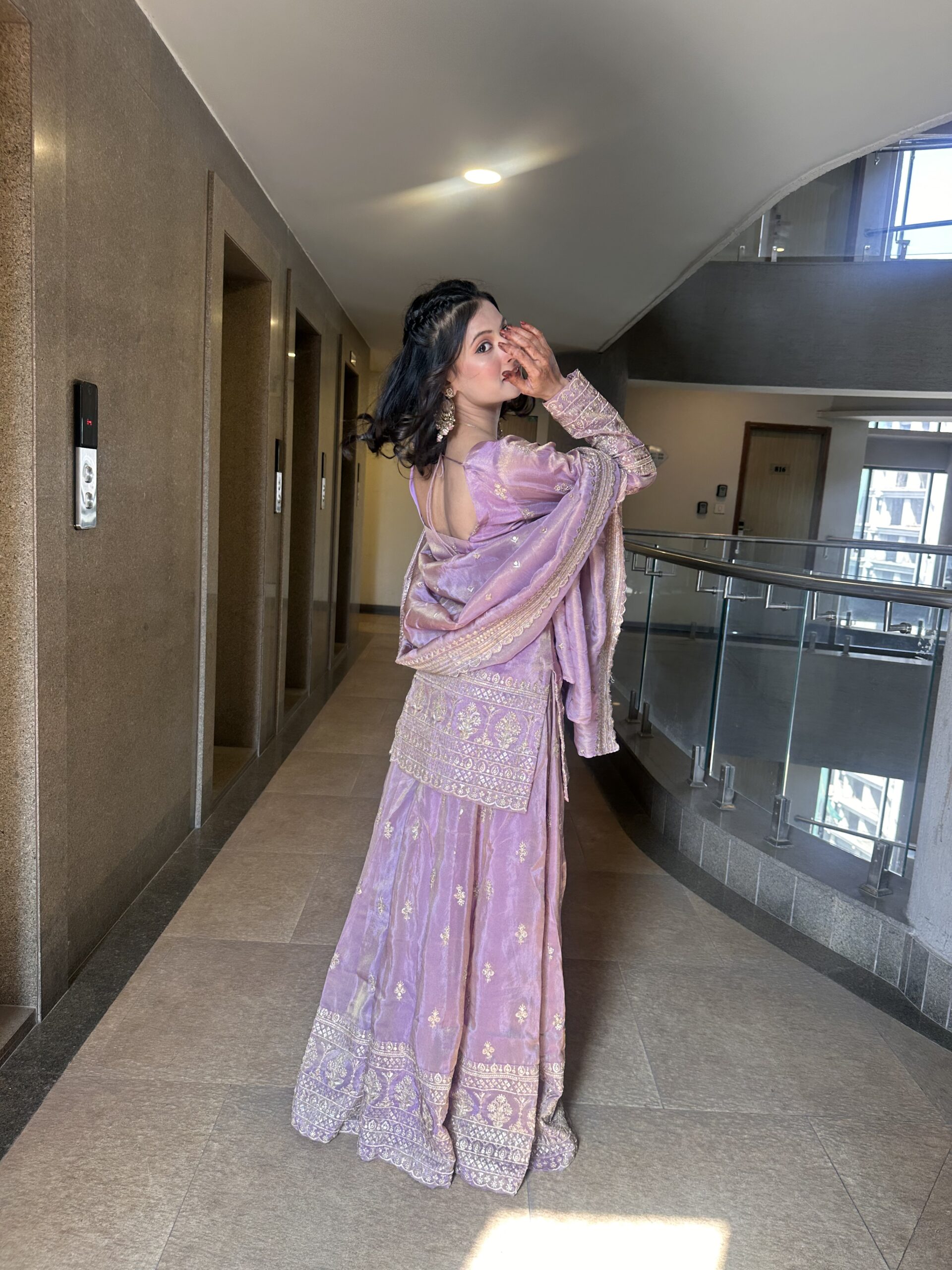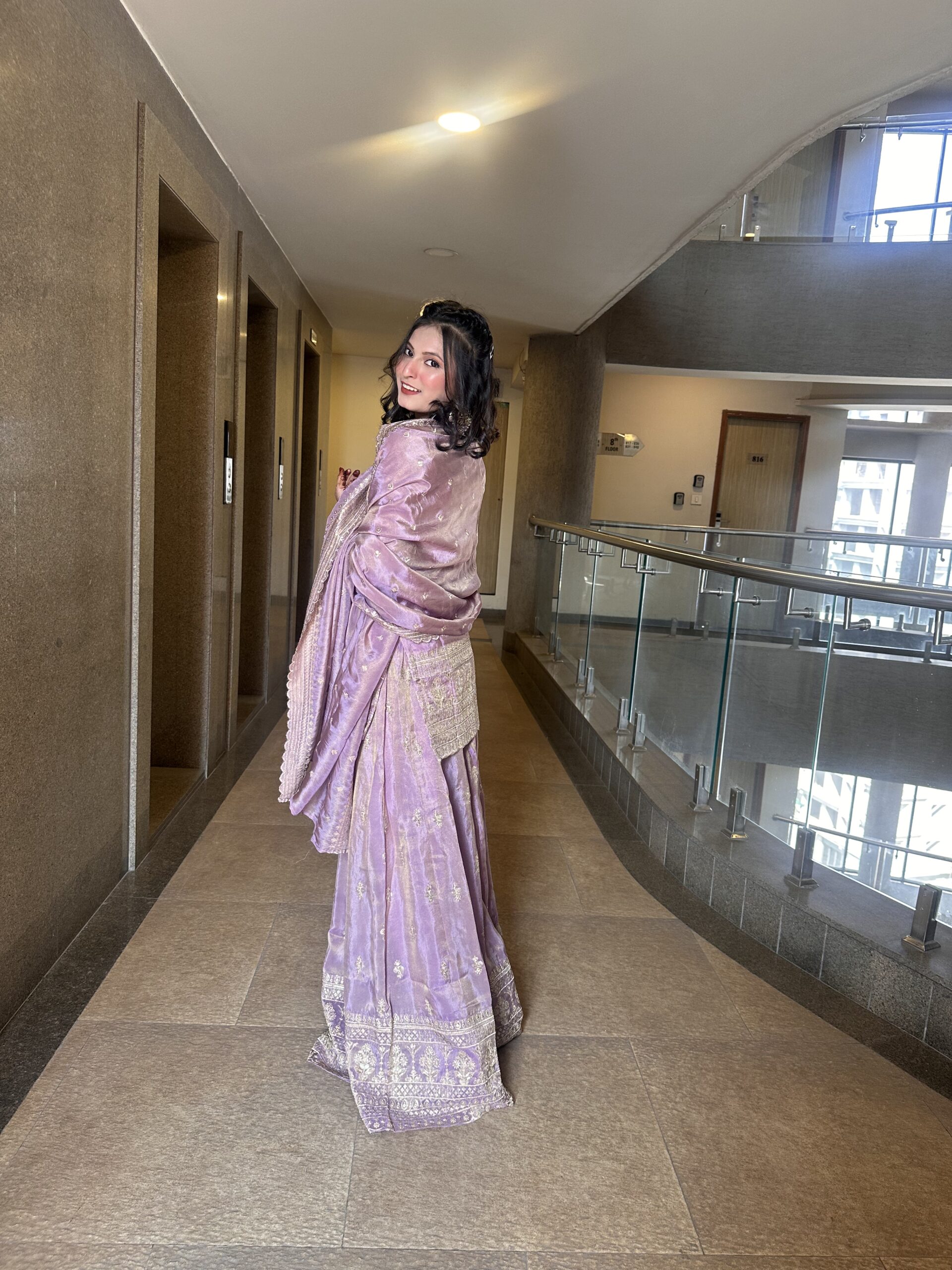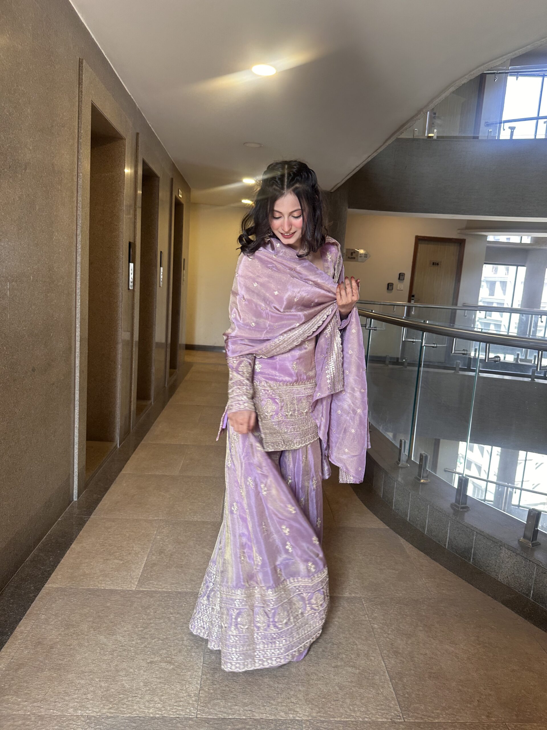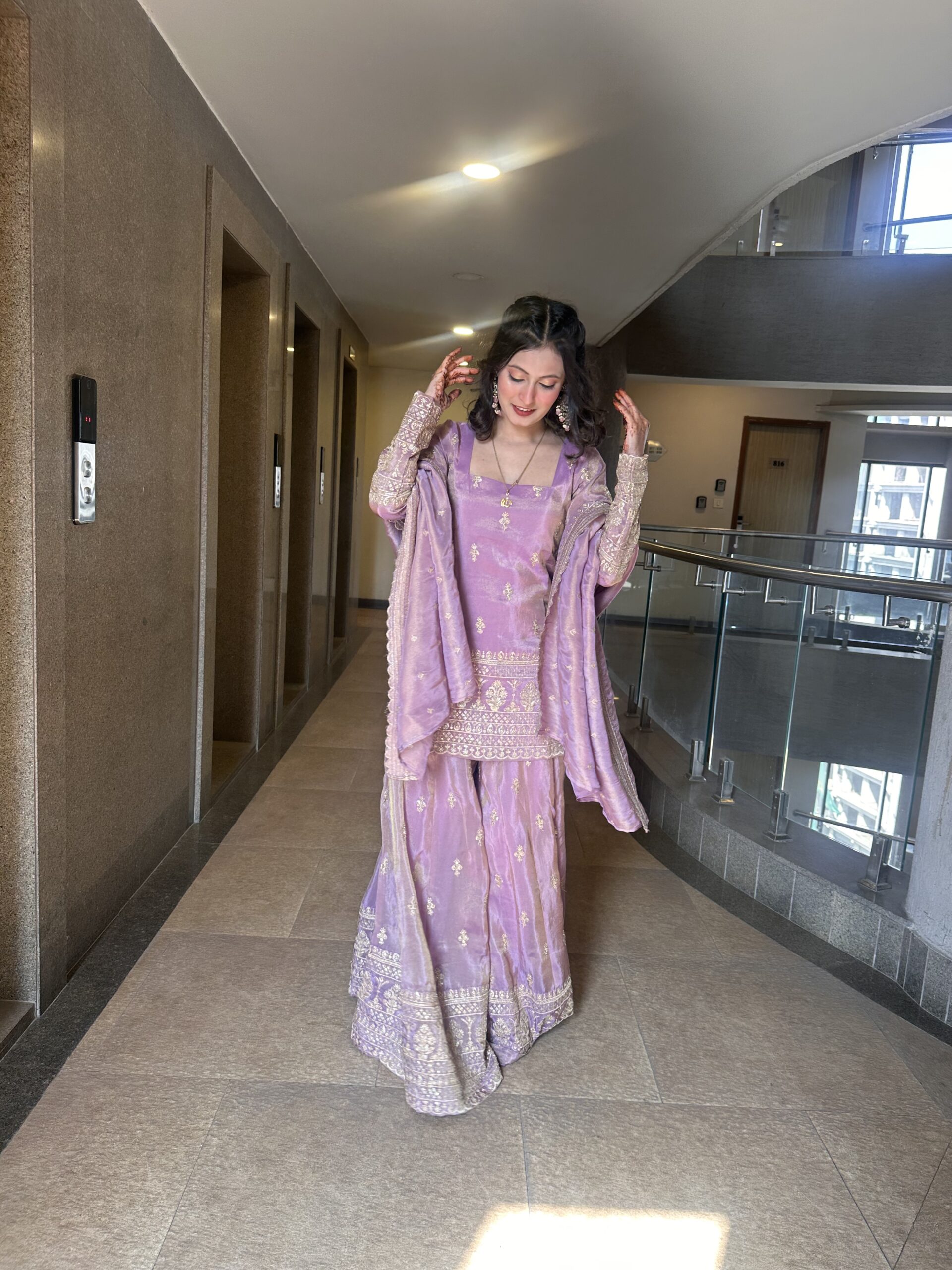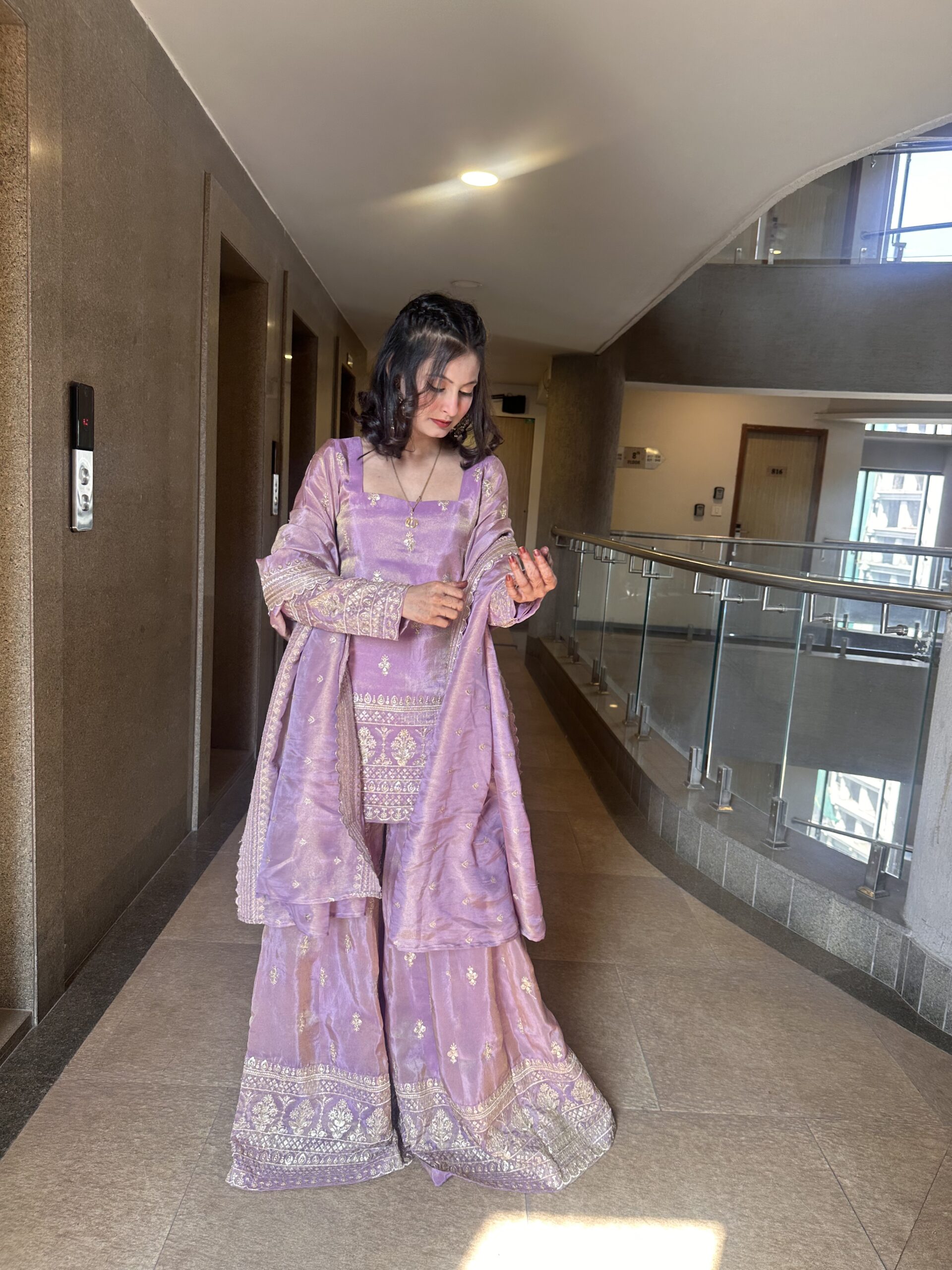This lavender kalidar sharara set is a perfect blend of elegance and comfort, designed for modern festive dressing. Crafted in premium barasi shimmer fabric, the outfit is enhanced with delicate embroidery and zari work, giving it a refined and luxurious appeal.