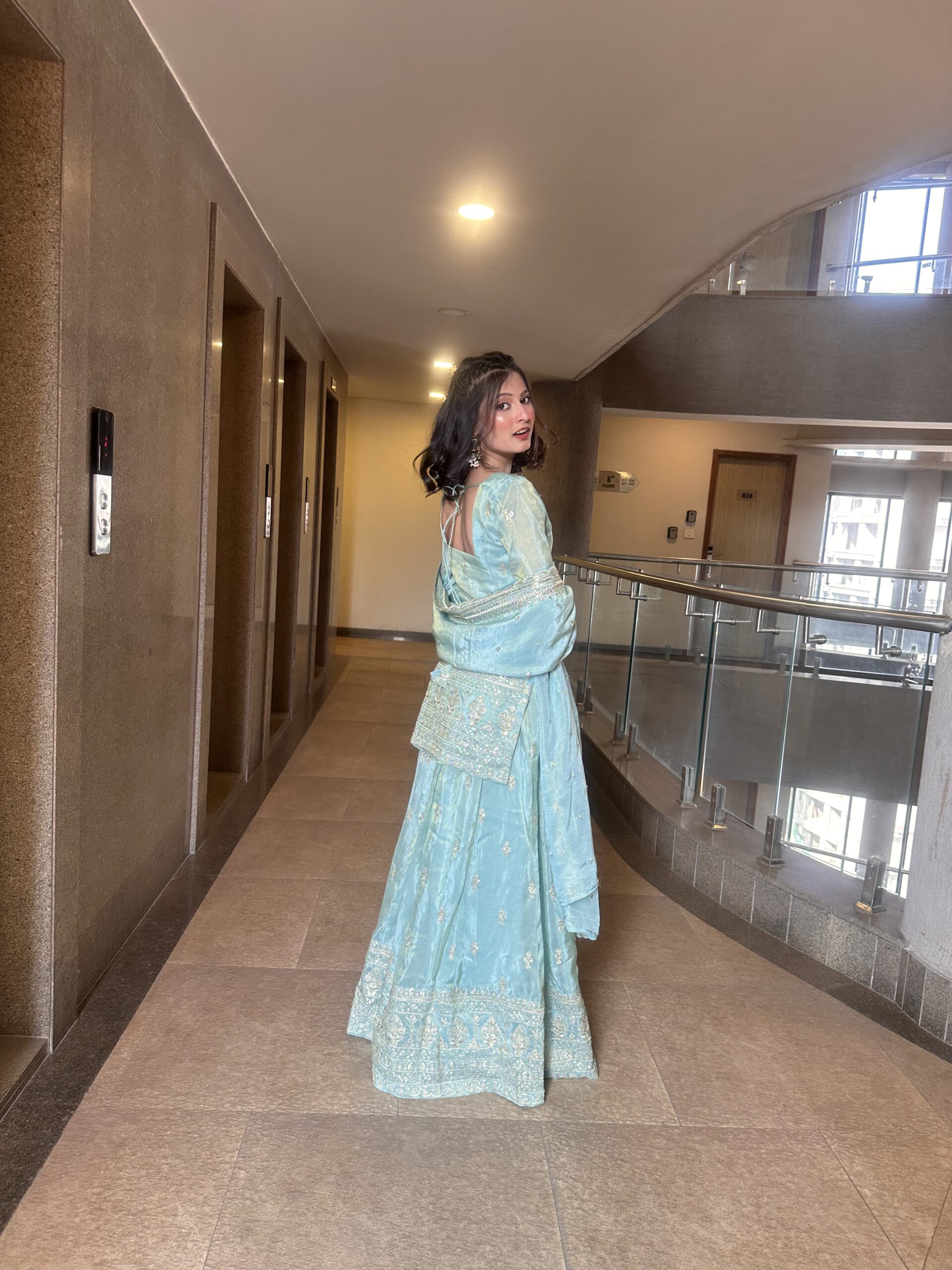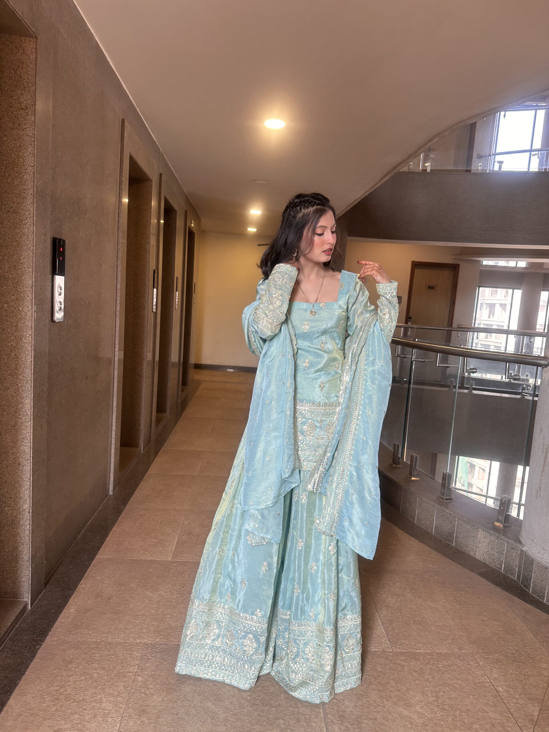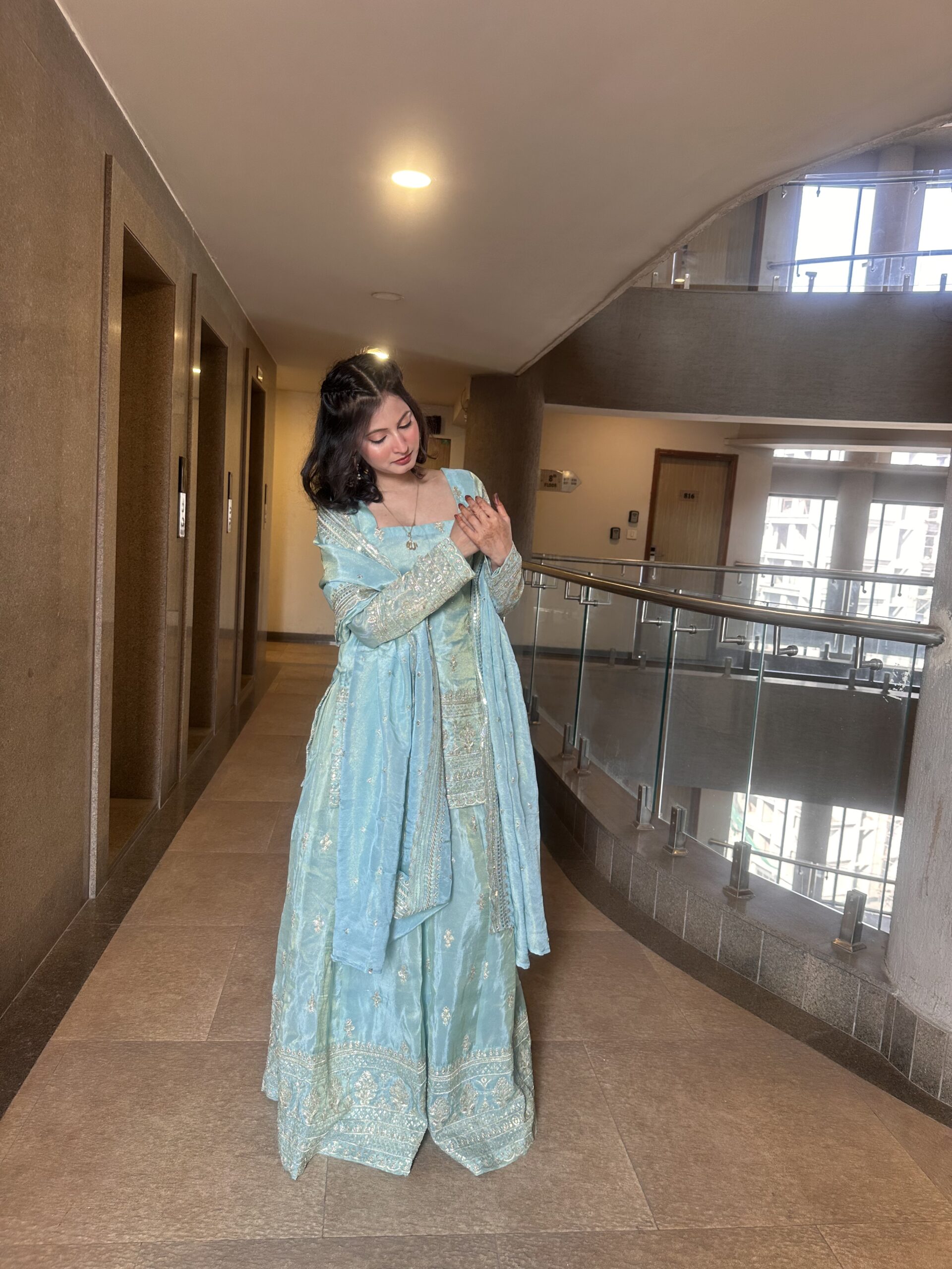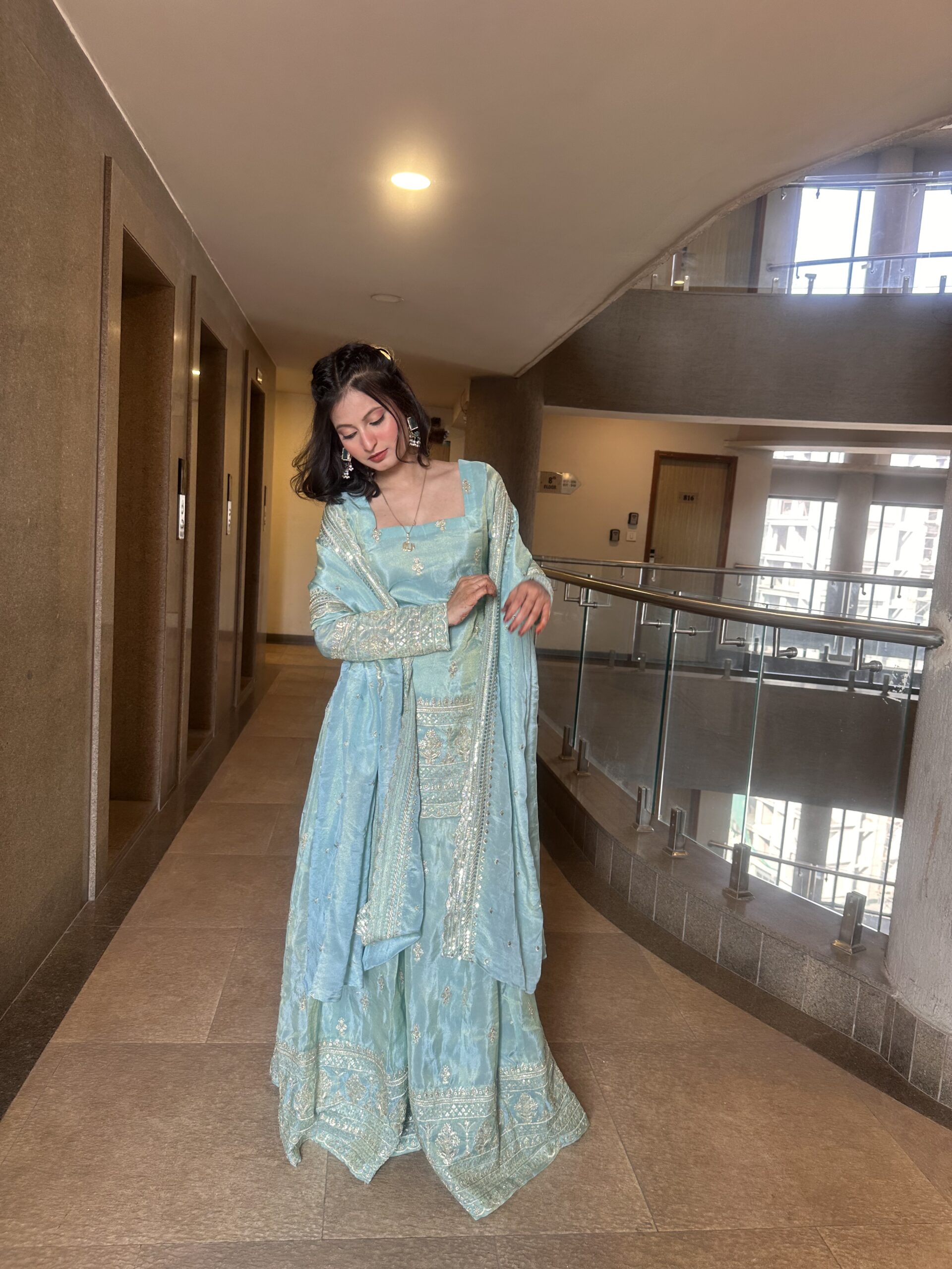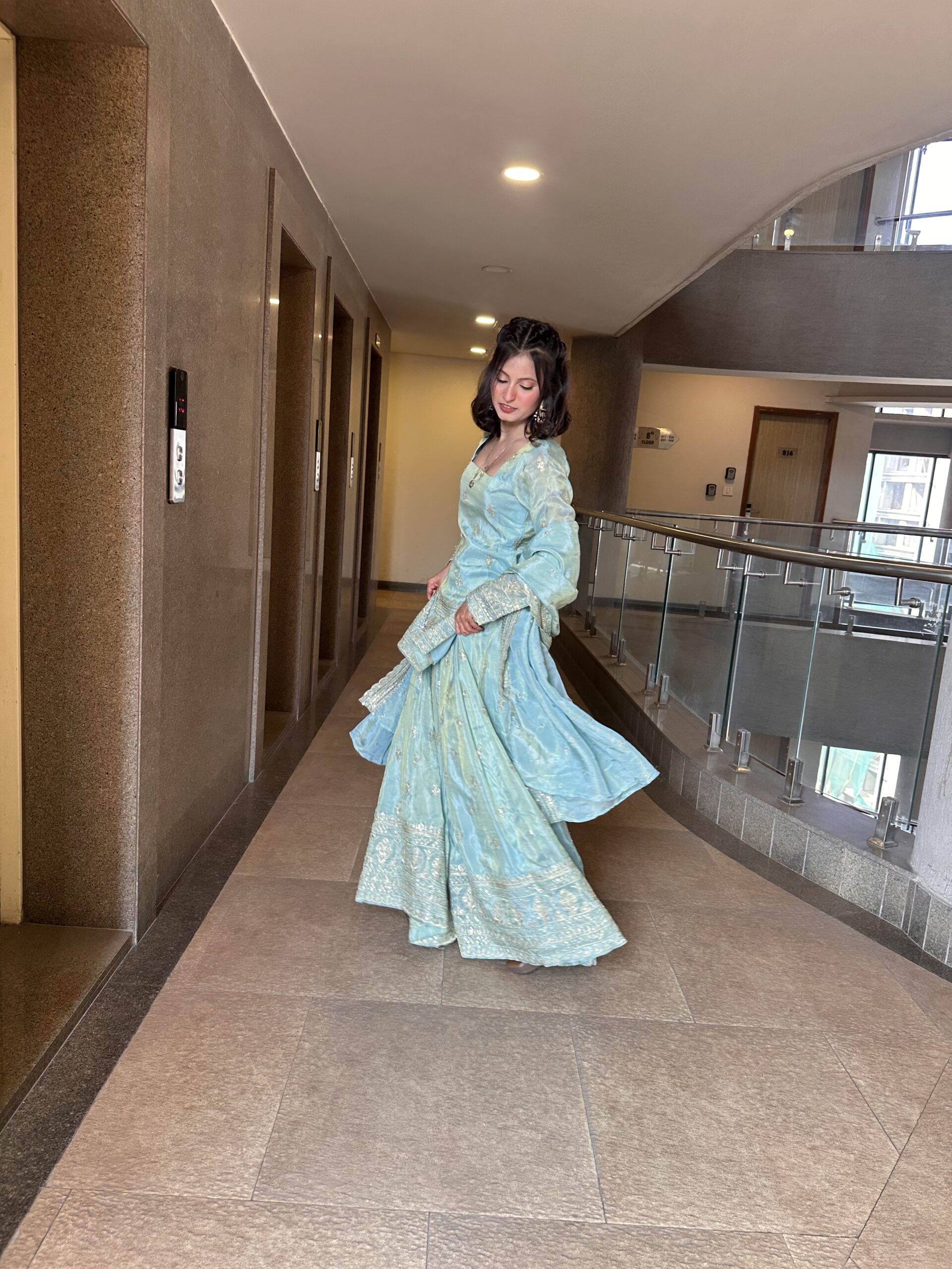 This Seafoam Blue kalidar sharara set is a perfect blend of elegance and comfort, designed for modern festive dressing. Crafted in premium barasi shimmer fabric, the outfit is enhanced with delicate embroidery and zari work, giving it a refined and luxurious appeal.